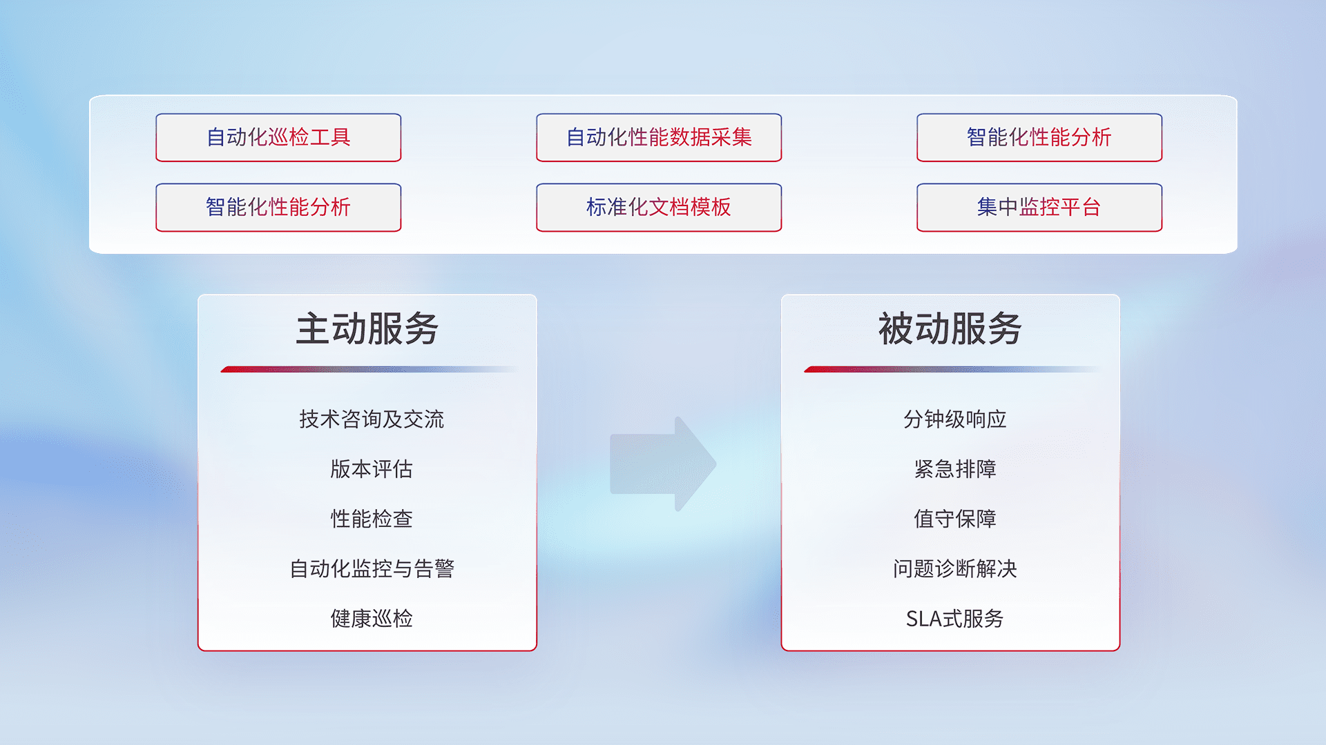 智能化工具和标准化文档,,,保障服务质量,,,提供主动服务(包含技术咨询、、版本评估、、性能检查、、自动化监控与告警、、、健康巡检)和被动服务包含(分钟级响应、、紧急排障、、、值守保障、、、问题诊断解决、、SLA服务)。。
